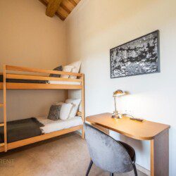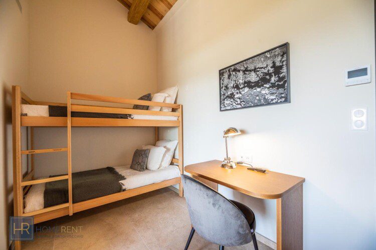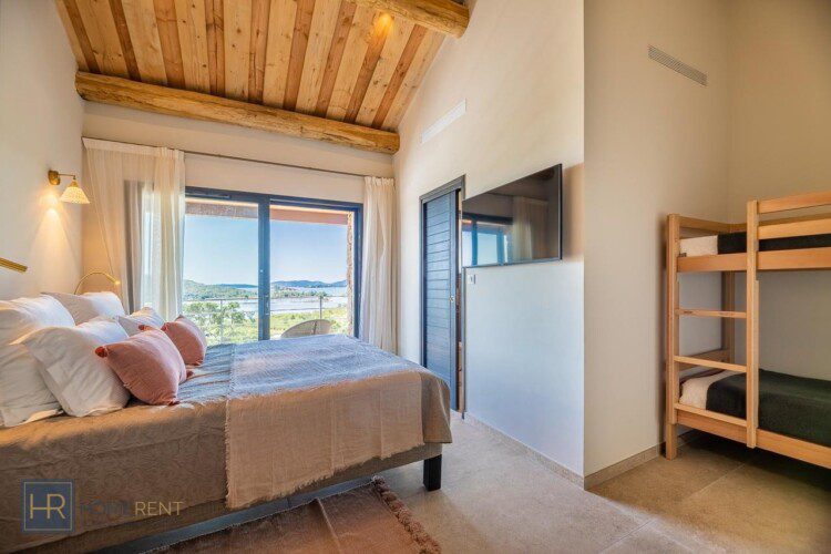 - Im Obergeschoss gibt es eine Schlafzimmersuite mit einem 180x200-Bett und einem Etagenbett mit 2x90, Duschbad, TV und Terrasse mit Meerblick.