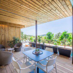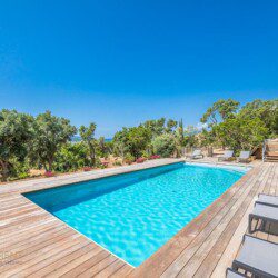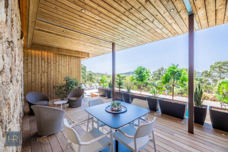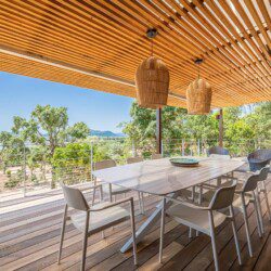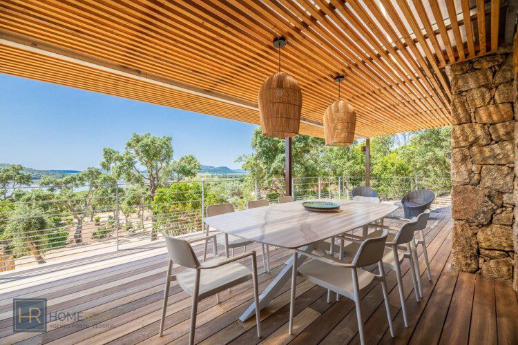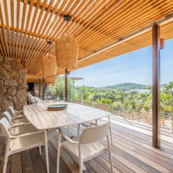 - Das Wohnzimmer mit seiner herrlich hohen Decke öffnet sich zur Hauptterrasse, das Esszimmer im Freien ist durch eine hübsche Holzpergola geschützt und bietet 12 Sitzplätze.