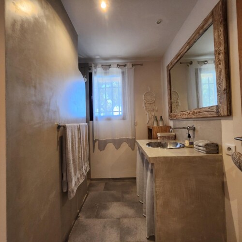- Zimmer Nr. 2, Bett 160, mit Blick auf den Poolgarten mit seinem Badezimmer