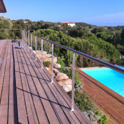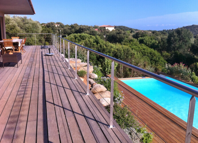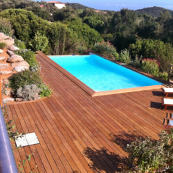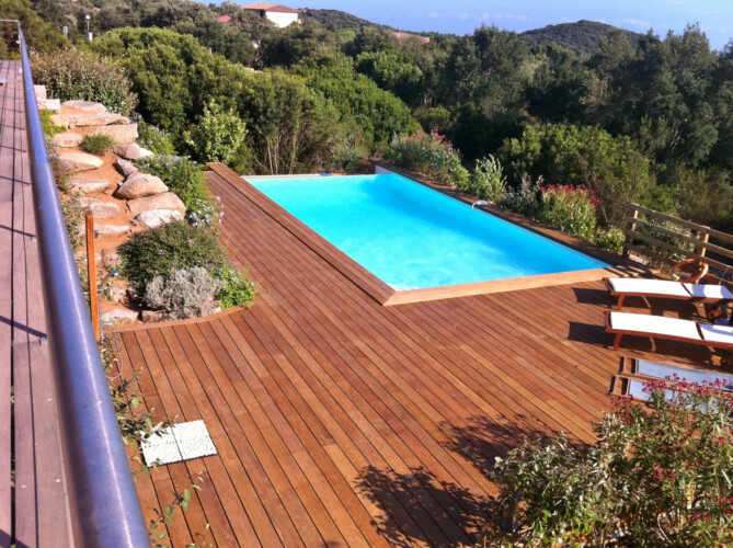 - Ein paar Stufen tiefer liegt ein alarmgesicherter Salzwasser-Infinity-Pool (10 m x 5 m) mit Blick auf den Garten, umgeben von einer großen IPE-Terrasse mit Liegestühlen und Sonnenschirm