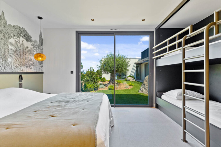 - PMR room (wheelchair accessible) : 160cm bed + bunk beds, bathroom with Italian shower & bathtub