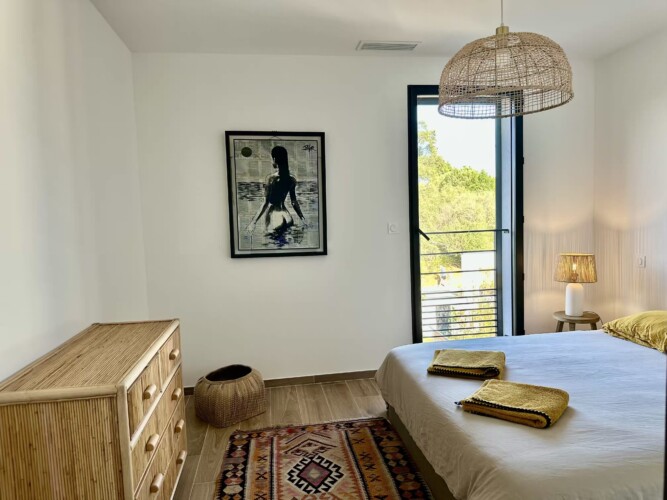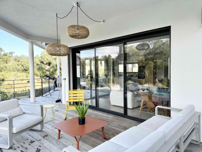 This 166 m² new villa rental on 2 levels is close to the Pinarello sea village and 5 km from Sainte Lucie de Porto-Vecchio and all amenities.