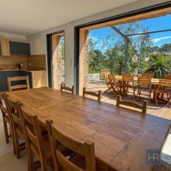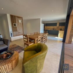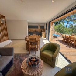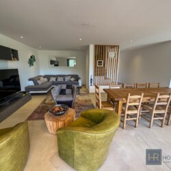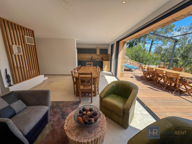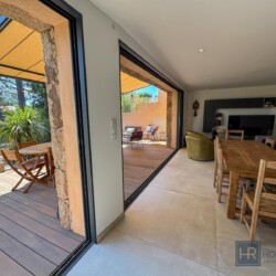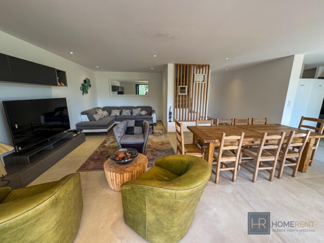 - Grand séjour lumineux avec baies vitrées donnant sur la terrasse, espace TV et canapés.