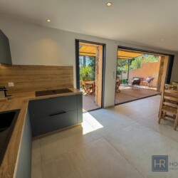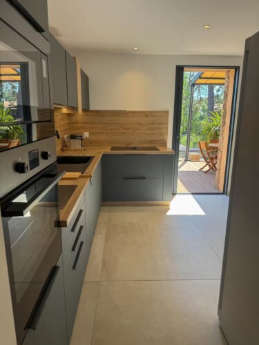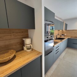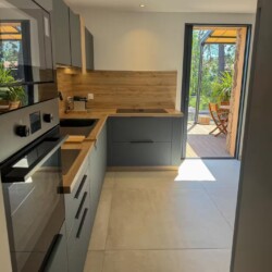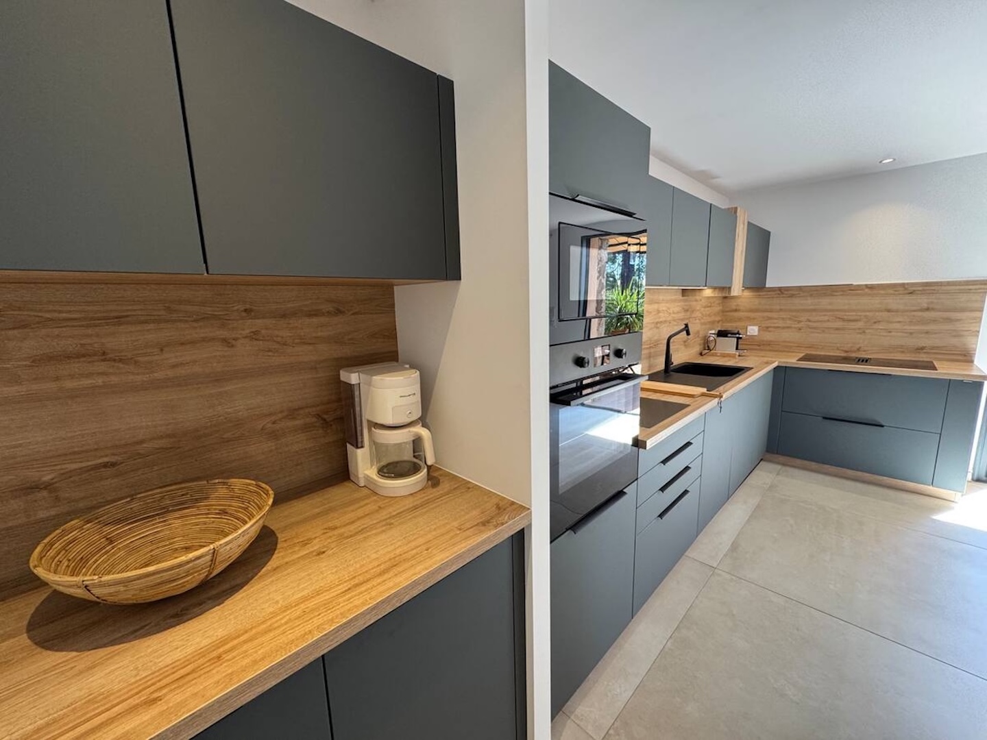 - Cuisine ouverte entièrement équipée : lave-vaisselle, four, micro-ondes, frigo américain, plaques induction, cafetière filtre, italienne et Nespresso. Renfoncement avec lave-linge.