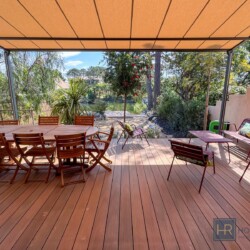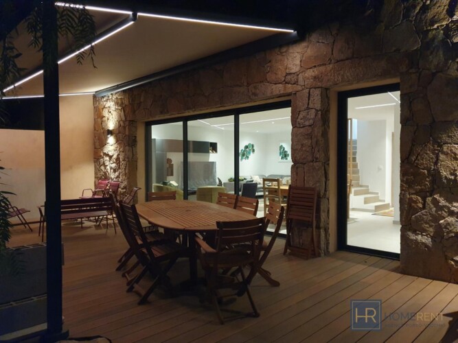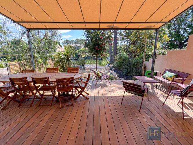- Spacieuse terrasse en bois ombragée par une pergola motorisée et éclairée.