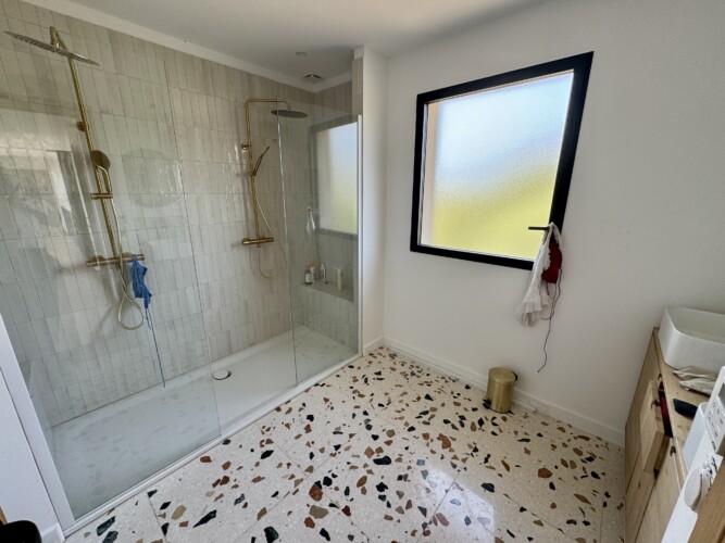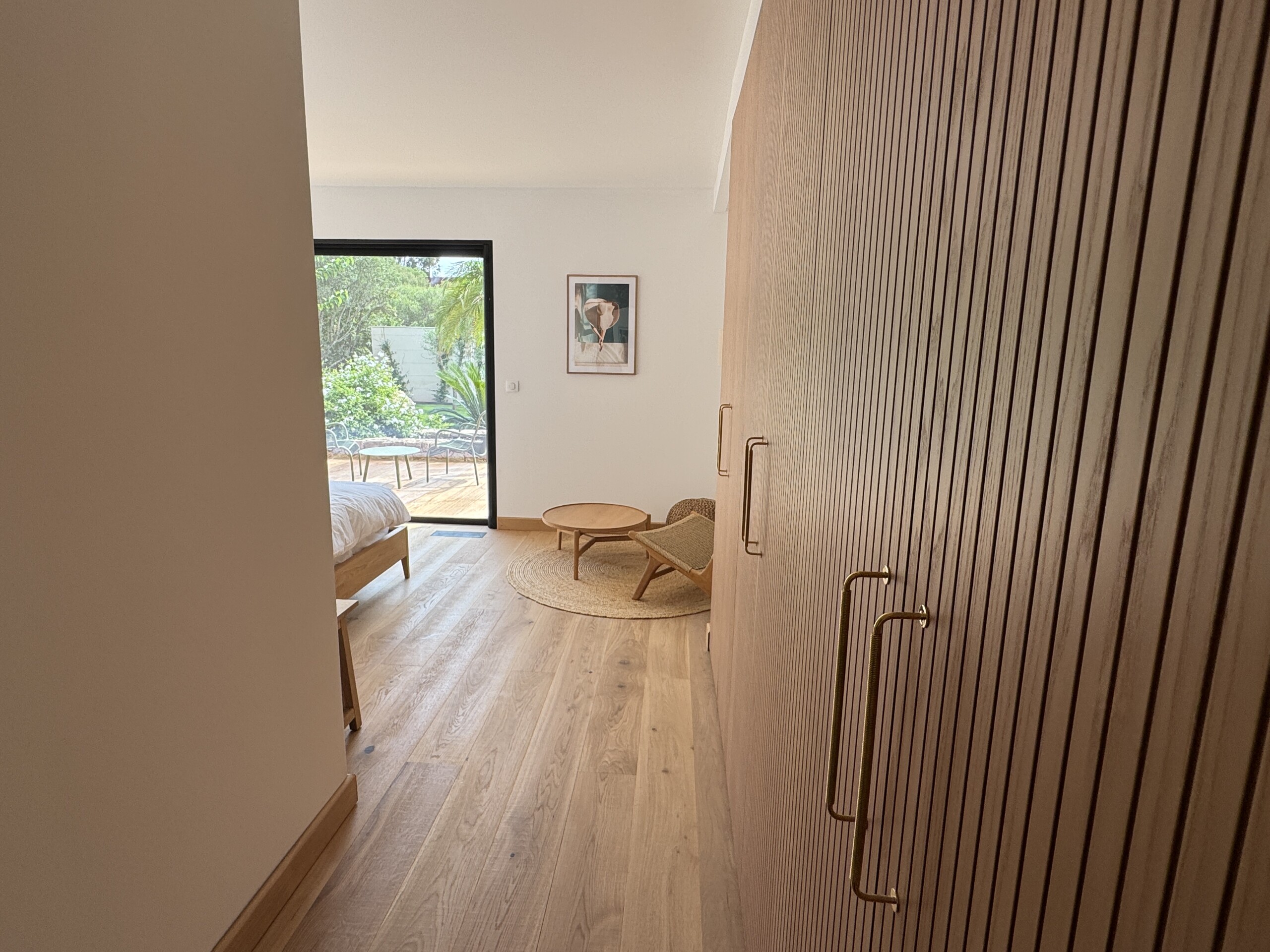 L’espace de vie principal s’ouvre sur une terrasse exposée Est, côté piscine : un magnifique bassin de 12 mètres, sécurisé par un volet roulant électrique, bordée d’une terrasse en IPE.