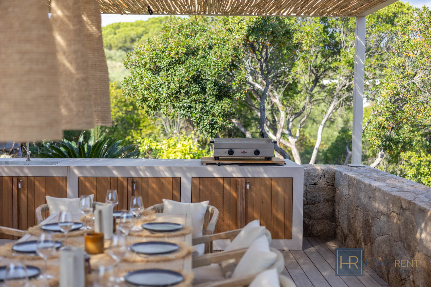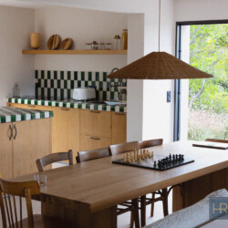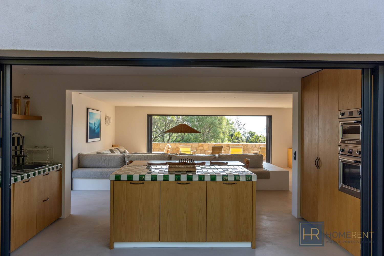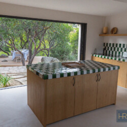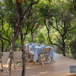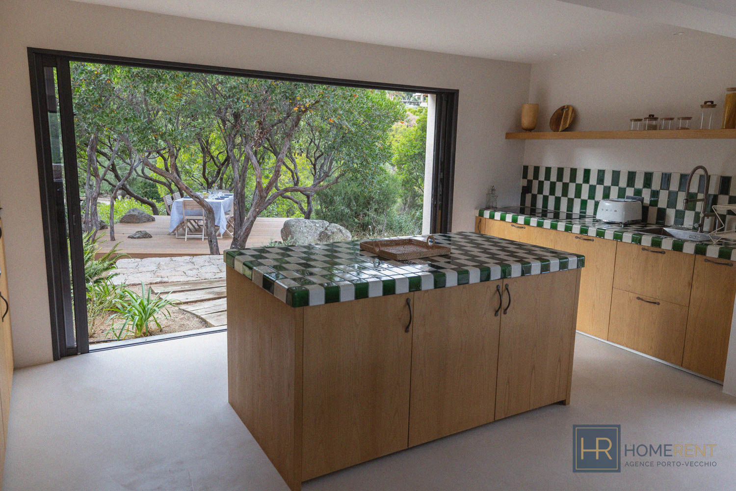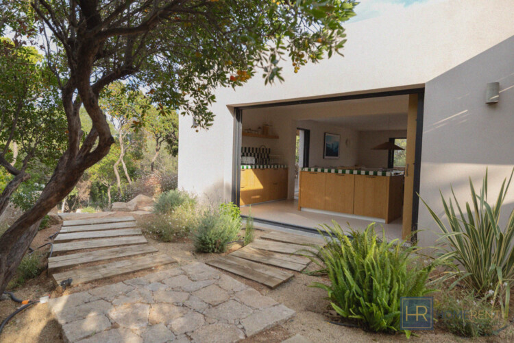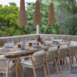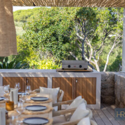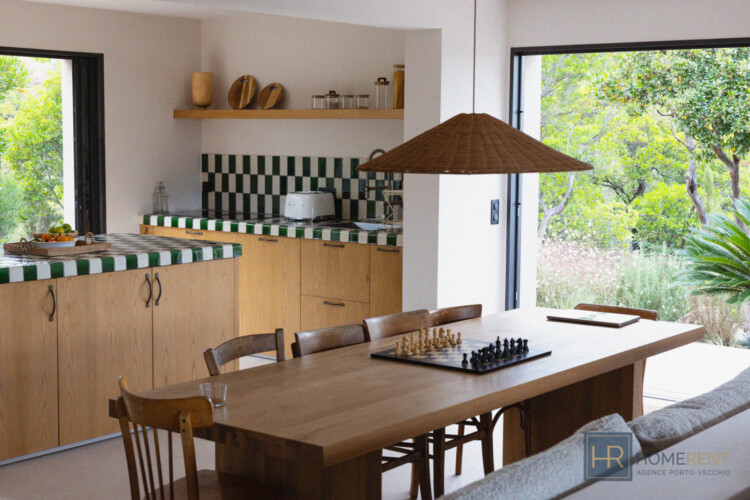 - Cuisine avec îlot central entièrement équipée (grand réfrigérateur, four, lave-vaiselle, cafetière filtre, Nespresso etc…), donnant sur une autre terrasse ombragée avec un 2e espace repas.